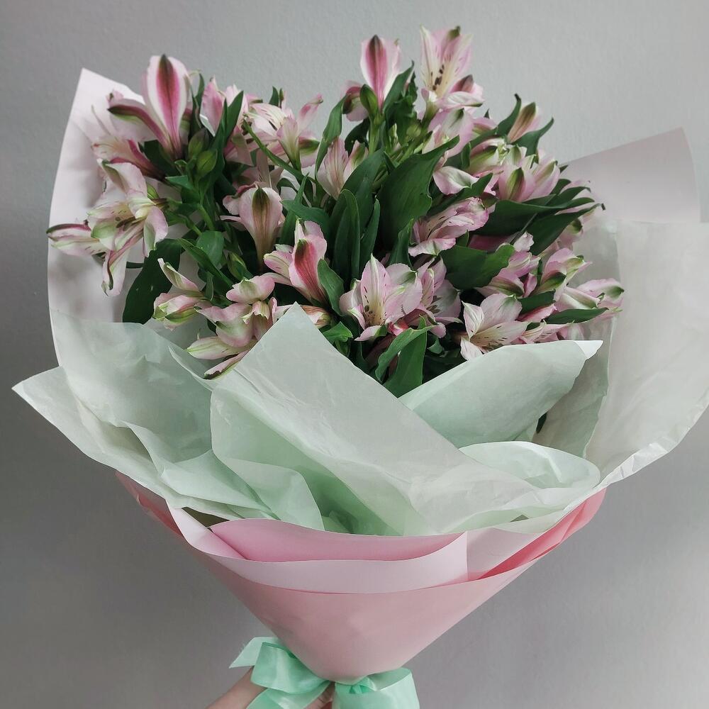 Альстромерия – 15 шт.Тишью – 2 шт.Авторская упаковка – 1 шт.Лента атласная – 1 шт.