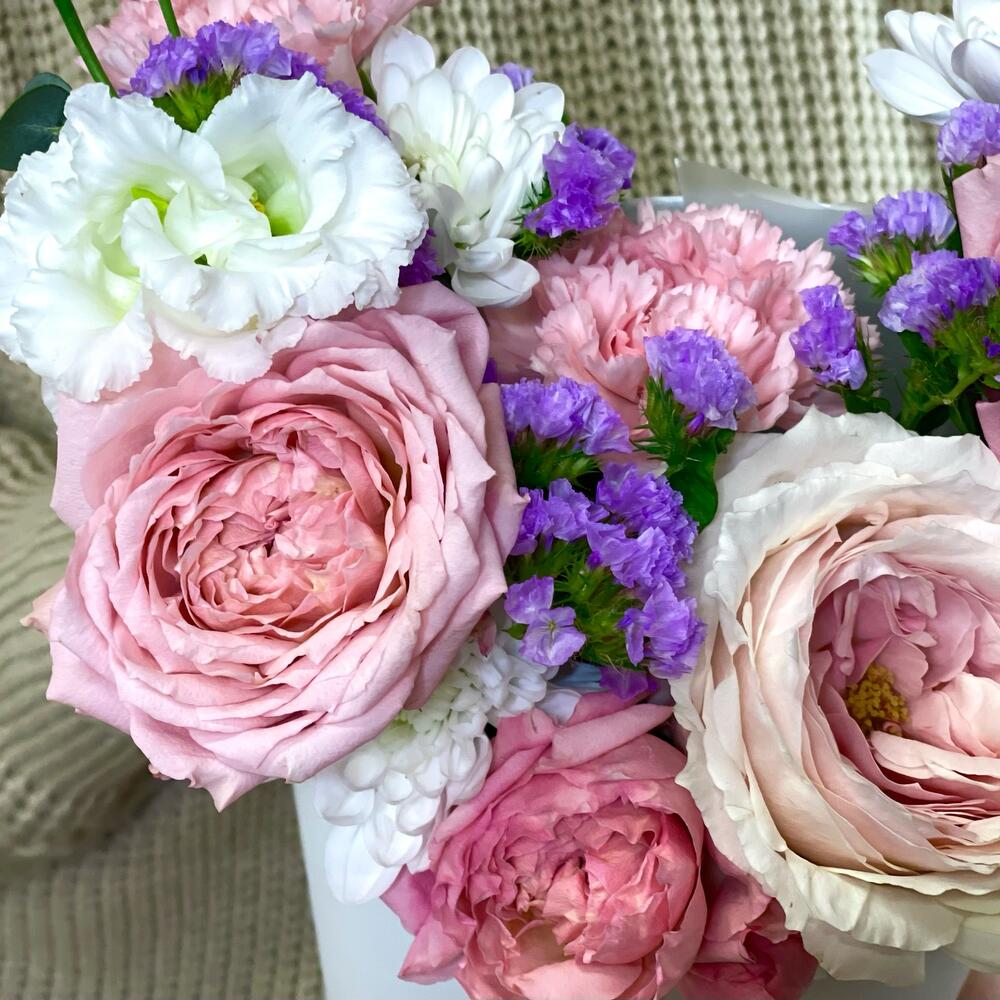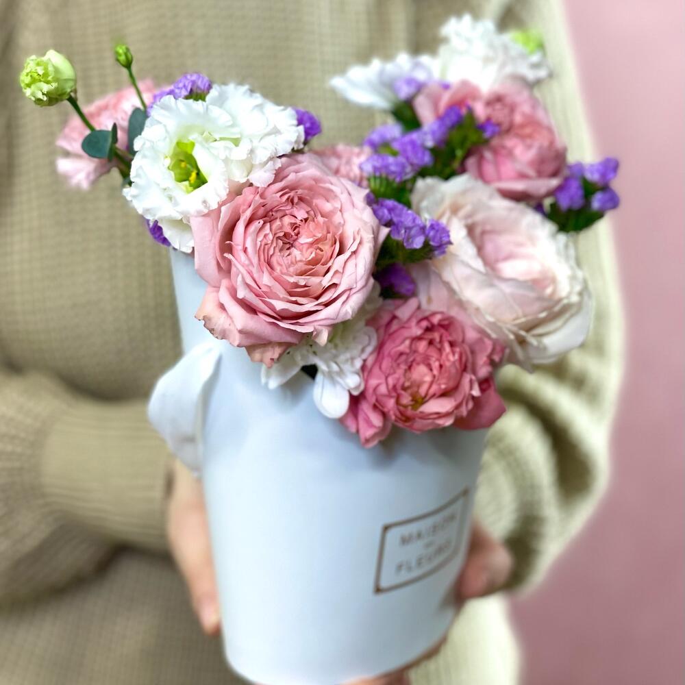Роза пионовидная – 1 шт.Роза кустовая розовая – 1 шт.Лизиантус – 2 шт.Хризантема кустовая – 1 шт.Статица синяя – 1 шт.Коробка – 1 шт.