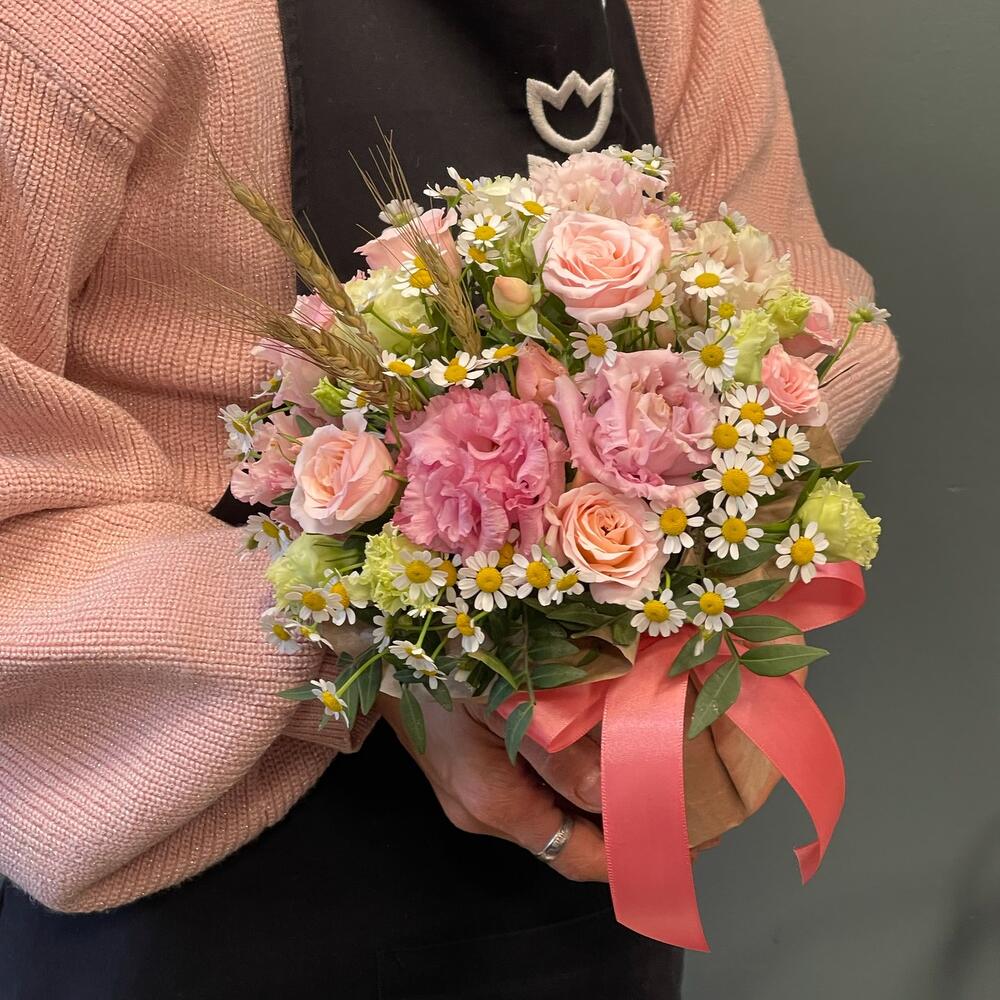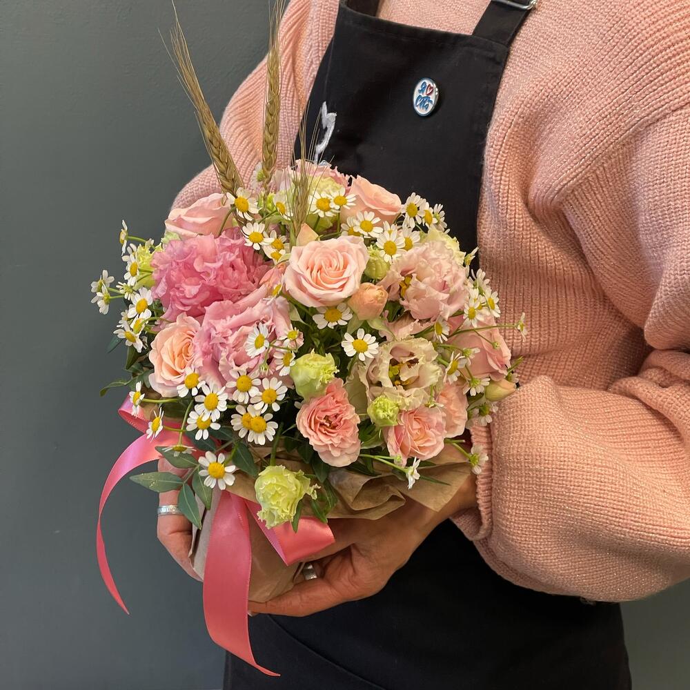Лизиантус – 2 шт.Роза кустовая – 1 шт.Матрикария – 2 шт.Фисташка – 1 шт.Колоски – 3 шт.Упаковка дизайнерская – 1 шт.Оазис флористический – 1 шт.