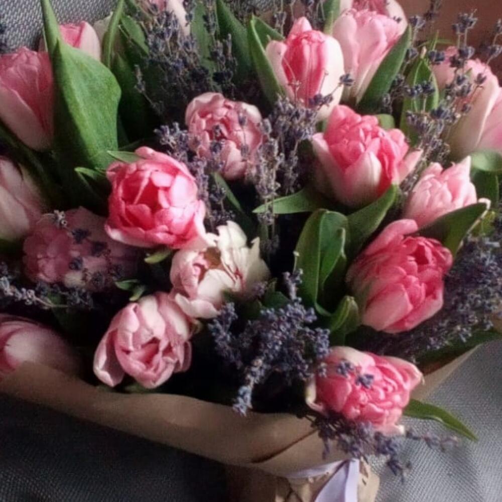 Тюльпан пионовидный – 25 шт.Лаванда (сухоцвет) – 175 шт.Крафт упаковка – 1 шт.Лента атласная – 1 шт.Пакет подарочный – 1 шт.
