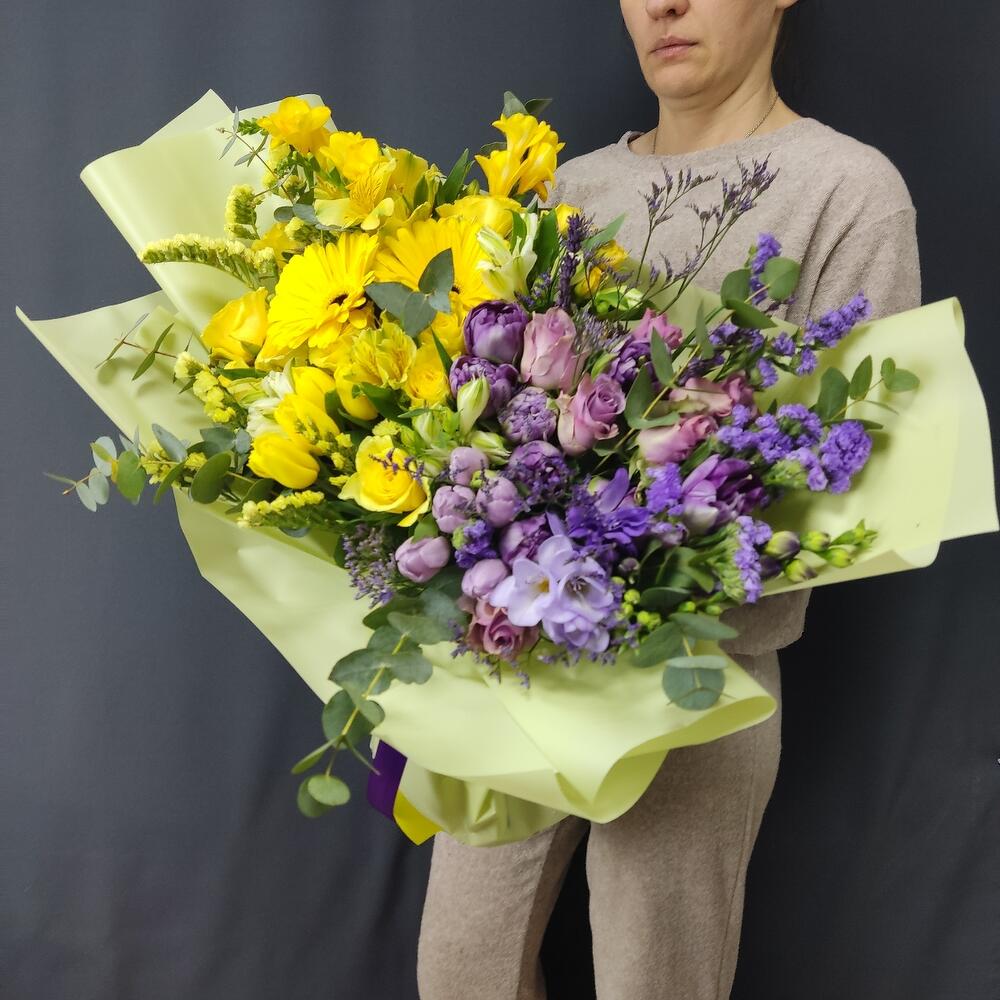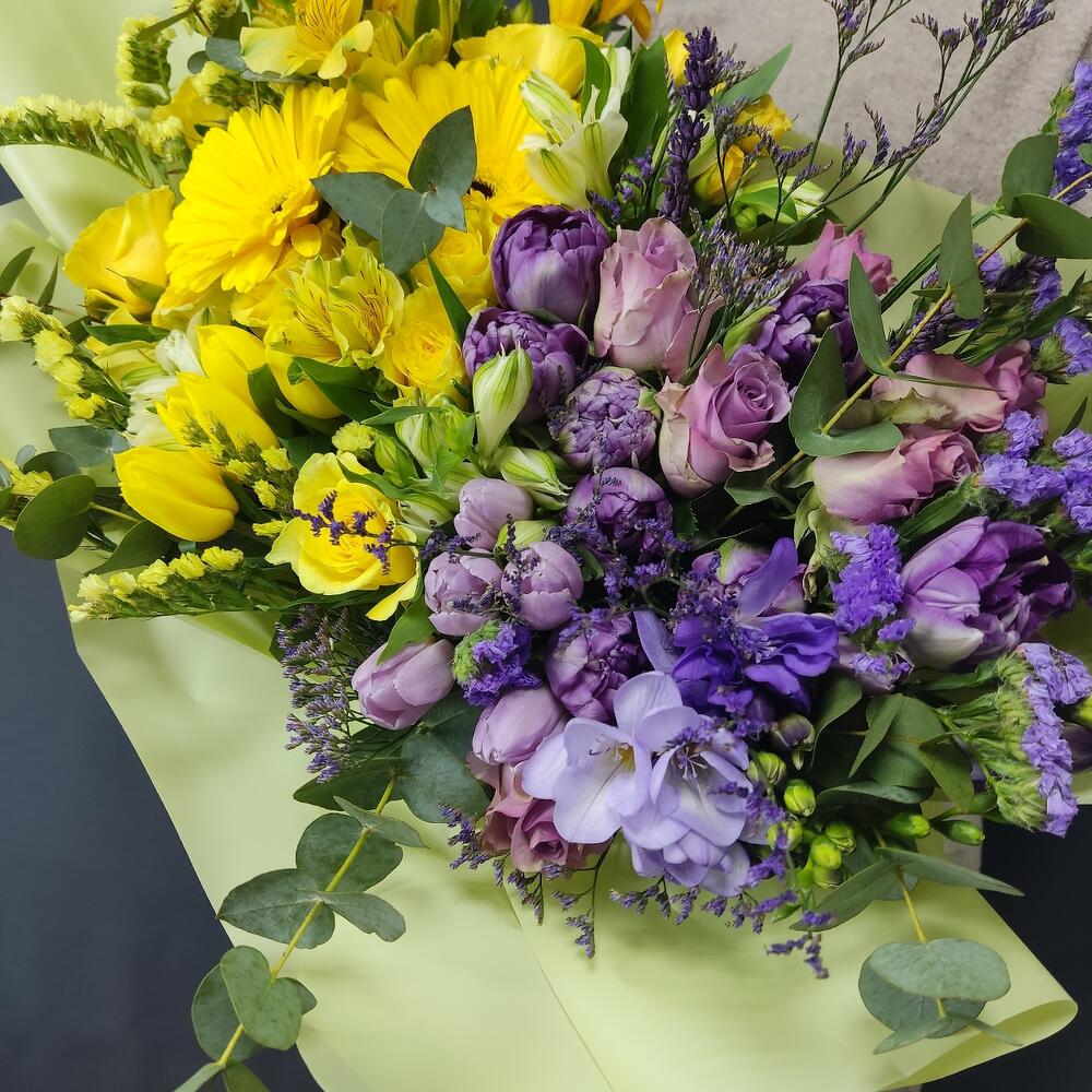 Лимониум – 3 шт.Статица – 4 шт.Тюльпан – 14 шт.Фрезия – 3 шт.Эвкалипт – 5 шт.Гербера – 1 шт.Дизайнерская упаковка – 1 шт.розы – 9 шт.